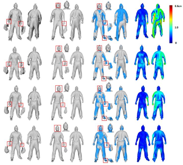 | We extend FOF by: 1) designing a new reconstruction framework greatly mitigating the performance degradation caused by texture and lighting effects; 2) proposing a robust mesh-to-FOF conversion algorithm with an automaton-based discontinuity matcher to enable real-time execution and significantly improve the system's robustness when facing challenging poses; and 3) proposing a FOF-to-mesh algorithm with a Laplacian coordinate constraint for greater robustness and fidelity. |