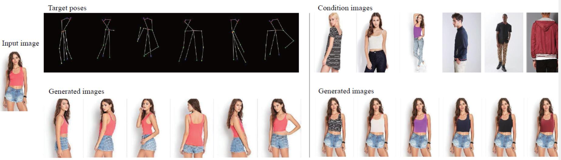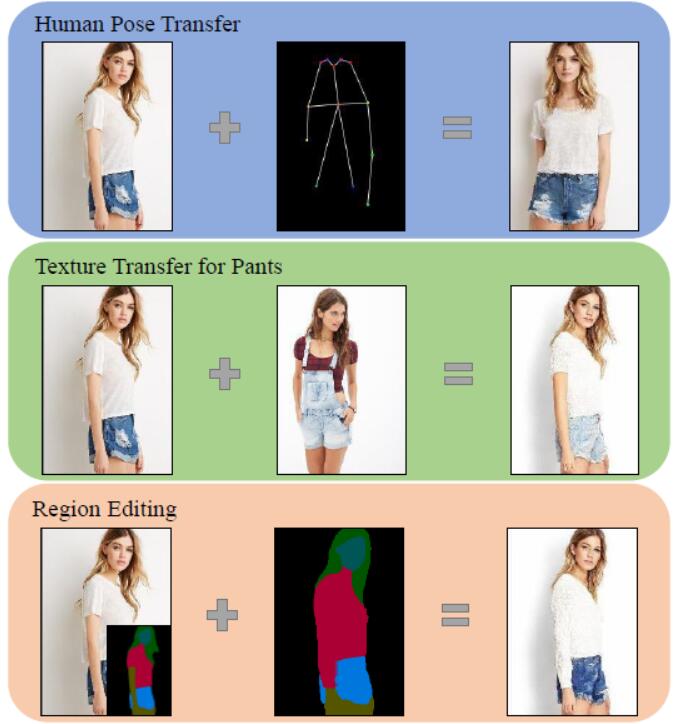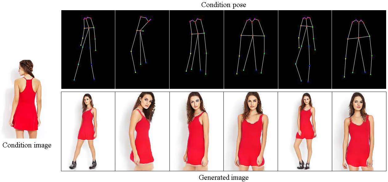 | This paper proposes an adaptive human pose transfer network with two hierarchical deformation levels. Our model has very few parameters and is fast to converge. Furthermore, our method can be applied to clothing texture transfer. |