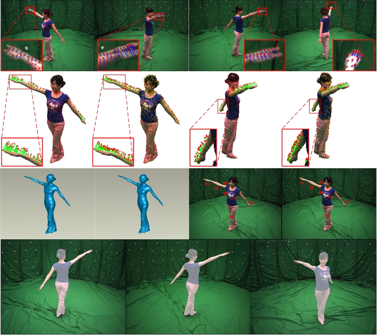 | We present a novel global non-rigid registration method for dynamic 3D objects. Our method allows objects to undergo large non-rigid deformations, and achieves high quality results even with substantial pose change or camera motion between views. In addition, our method does not require a template prior and uses less raw data than tracking based methods since only a sparse set of scans is needed. |