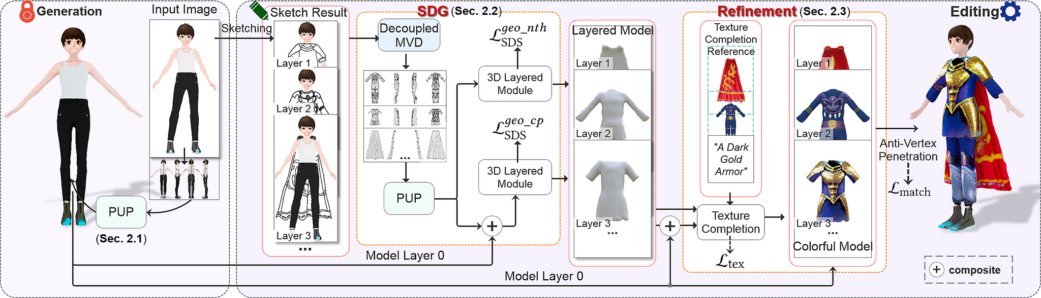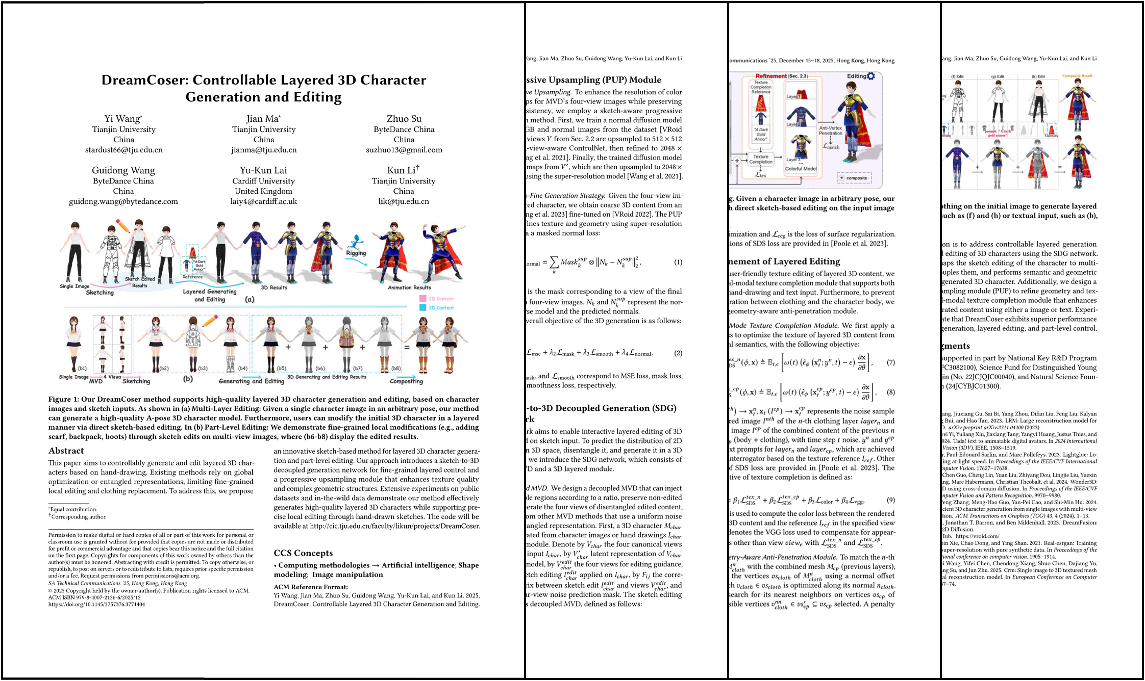 Yi Wang, Jian Ma, Zhuo Su, Guidong Wang, Yu-Kun Lai, Kun Li. "DreamCoser: Controllable Layered 3D Character Generation and Editing". SIGGRAPH Asia 2025 Technical Communications, 2025.