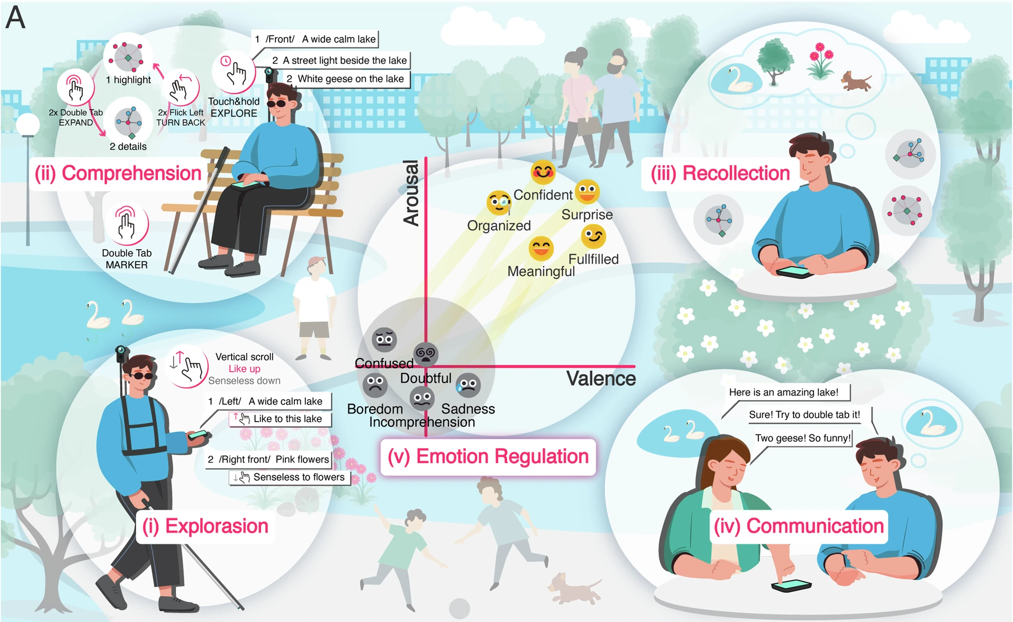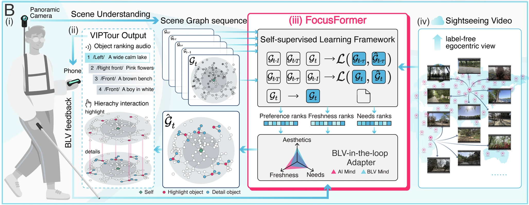 Engaging with nature significantly enhances well-being, yet millions of individuals with blindness and low vision (BLV) are often excluded from these benefits due to constrained environmental perception. Here, we introduce VIPTour, an AI-driven system powered by the FocusFormer algorithm, which transforms complex scenes into structured, personalized graphs using tailored attention mechanisms and a BLV-in-the-Loop Adapter. Through intuitive, user-centered interaction, VIPTour facilitates active exploration and in-depth comprehension during dynamic sightseeing, while enabling accurate, long-lasting recollection and effective communication among BLV individuals post-journey. Extensive experiments demonstrate that VIPTour significantly enhances positive emotions and memory retention, with a 67.9% increase in positive emotional response, a 94.7% rise in arousal, a 772.73% improvement in cognitive mapping accuracy, and a 200% enhancement in long-term memory accuracy. These results underscore VIPTour’s ability to deliver an unparalleled, enjoyable, and memorable experience, promising profound benefits for the BLV community.