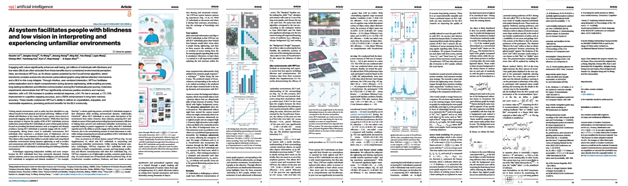 Haozhe Lin, Jiangtao Gong, Yu Wang, Jinsong Zhang, Bing Bai, Yan Zhang, Luyao Wang, Chenyu Wei, Yancheng Cao, Kun Li, Ruqi Huang, Guyue Zhou. "AI system facilitates people with blindness and low vision in interpreting and experiencing unfamiliar environments". npj Artificial Intelligence 2025.