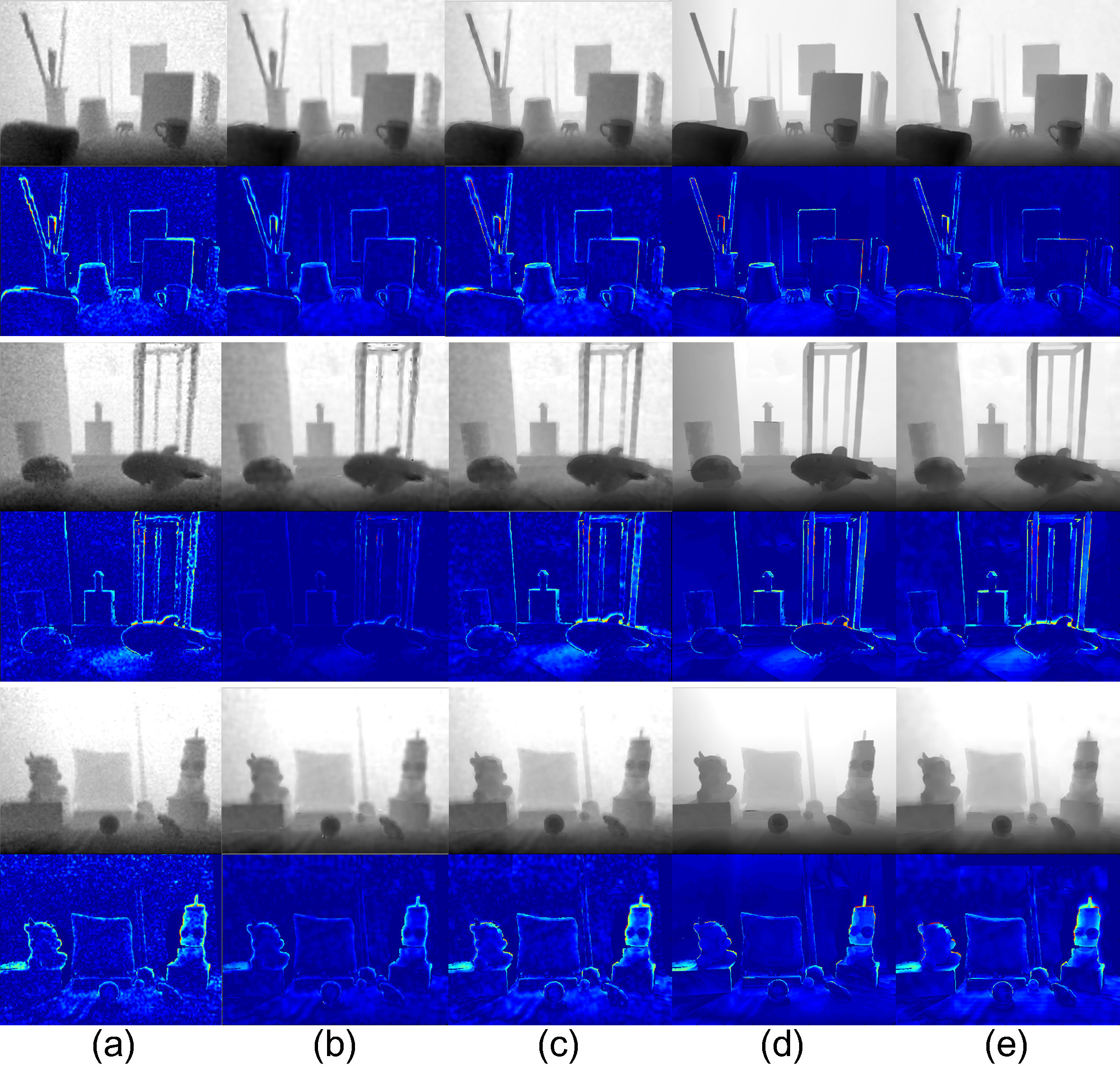 ![]() Fig. 6. Visual quality comparison on depth recovery for Books, Shark, Devil from ToFmark datasets [14]: (a) Bicubic, (b) IMLS [2], (c) CLMF0[7], (d)TGV [9], and (e) our method. For visual inspection, the error maps are shown by subtracting between recovered depth and ground truth. |