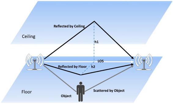 人的活动会引起无线Wi-Fi信号传播路径的改变,这些变化可以通过物理层的信道状态信息(Channl Static Information)反映。通过对采集到的无线信道状态信息进行分析,实现实时的,无需携带特殊的设备的动作及行为细粒度的检测。该检测过程有效利用常用信号处理方法配合数据挖掘的算法。该研究方向是当今物联网及移动计算领域的热点问题。可以广泛应用于室内定位、安全监控、针对老人和小孩的家庭医疗监护、新型人机交互等。如左图发射端(Access points)发射无线信号,传输的多路径信号经过运动的人体、地面、天花板等反射被接收端(Monitoring points)接收,经过对接收到的信道状态信息的一系列智能化分析,可最终识别人的动作、姿势等。 |