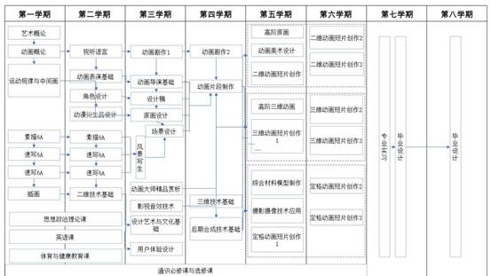 动画专业围绕培养目标,构建通识教育+工作室培养两段式培养模式,构建以专业基础、专业核心课程为一体,开拓人文、艺术、设计学及数字技术基础课程的课程体系,全面培养学生的艺术思维、设计思维、数字思维能力。