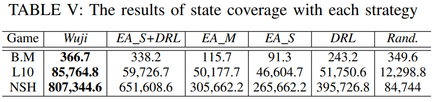 另一方面,上表统计了不同算法在游戏测试过程中的状态空间的覆盖情况(去重后的状态数量)。可以发现,Wuji 相比其他算法在同样的设备与测试时间下,探索到了更多的状态空间,这也进一步解释了Wuji能够发现更多bug的原因。