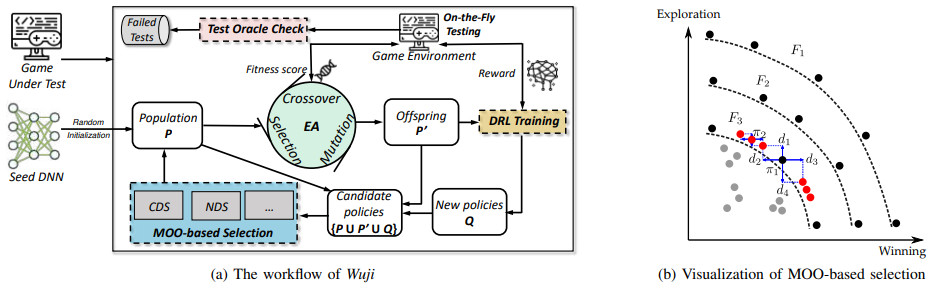 为此,首选我们针对四款网易游戏产品中的 1349 个真实 bug 进行深入分析,并针对性的提出了四个用于 bug 检测的 oracle。其次,我们提出了实时游戏测试框架 Wuji,通过融合了进化算法,DRL 算法和多目标优化机制,实现了智能的自动化游戏测试。Wuji 在赢得游戏和探索游戏空间之间取得了较好的平衡。其中,赢得游戏可以使得智能体在游戏中取得进展;而空间探索则可以增加发现错误的可能性。