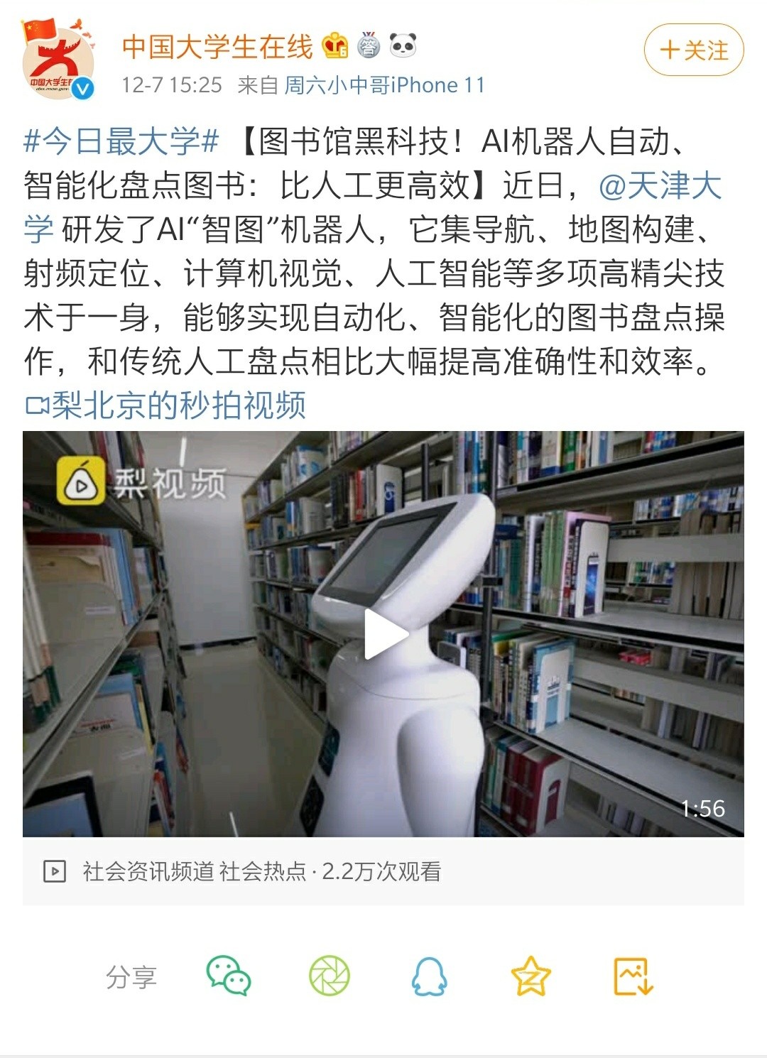 “智图”机器人可以准确判定每本图书摆放在哪个书架、哪一层、以及哪个位置。将盘点结果和数据库信息做比对,便可及时发现上报摆放错误的书籍。未来安上机械手臂,“智图”还能实现图书的自动归位。