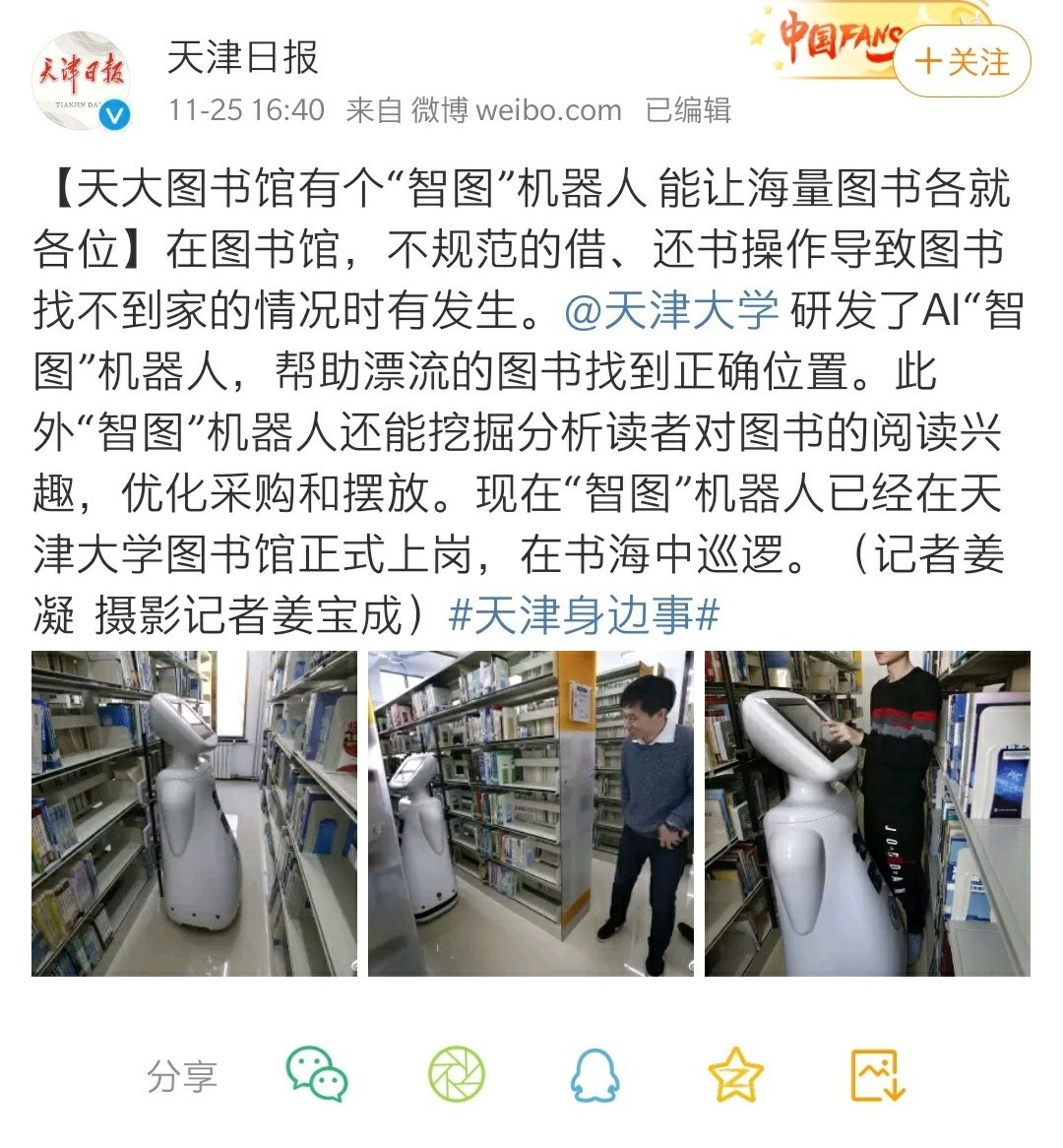 嘟嘟成人网 研发了AI“智图”机器人,帮助漂流的图书找到正确位置。此外“智图”机器人还能挖掘分析读者对图书的阅读兴趣,优化采购和摆放。