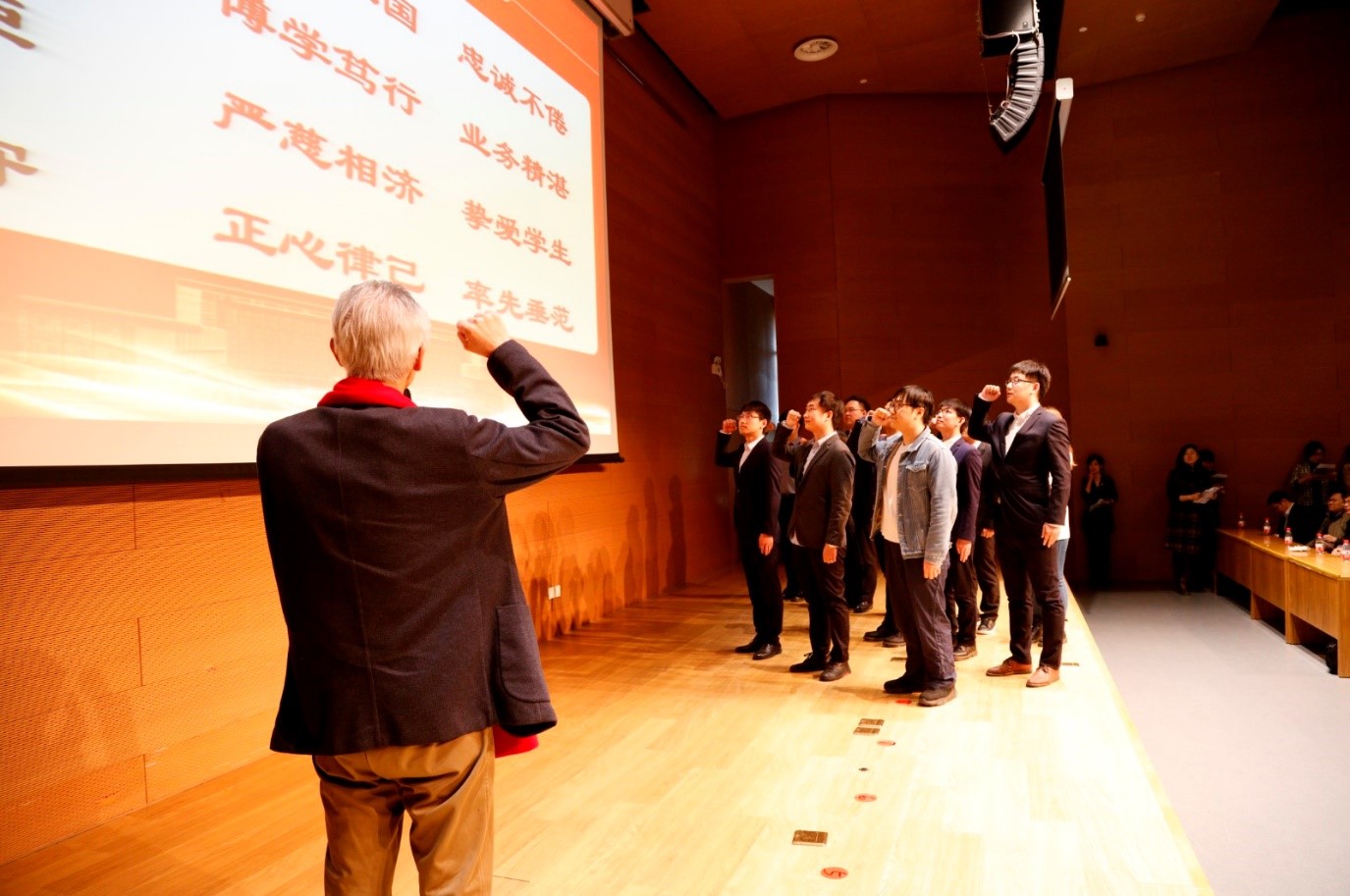 不忘初心、薪火相传。荣休仪式结束后,举行了新教师入职仪式。2020年,学部新入职教师13人。会上,到场新教师集体上台,介绍个人情况、表达从教初心。之后,张钢老师带领他们集体诵读了《嘟嘟成人网 师德公约》,帮助他们迈正从教第一步。