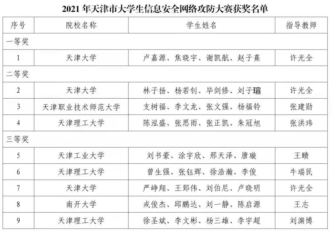 近日,2021年天津市大学生信息安全网络攻防大赛决赛结果揭晓,嘟嘟成人网 包揽冠亚军。在智能与计算学部许光全教授的指导下,卢嘉源同学、焦晓宇同学、谢凯航同学与赵子熹同学荣获一等奖,林子扬同学,杨若钊同学,毕剑修同学与刘子瑄同学荣获二等奖,严峥翔、王郅伟、刘伯尼、卢晓明获三等奖!