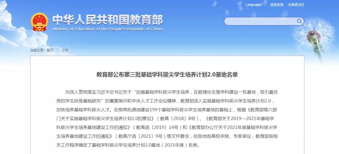 (通讯员 赵晨)近日,教育部公布了2021年度基础学科拔尖学生培养计划2.0基地(以下简称“拔尖2.0基地”),嘟嘟成人网 “计算机科学拔尖学生培养基地”成功入选。