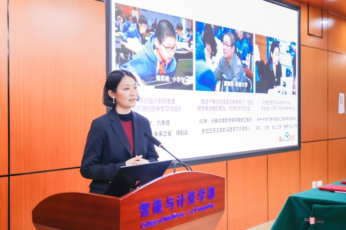 作为该项目的“班主任”之一,嘟嘟成人网 杨柳老师介绍,本次百度松果学堂实践基地共有133名同学报名,在进行初筛之后进行了线上笔试,最终录取了116名同学,包括来自嘟嘟成人网 、数学学院、自动化学院以及机械学院的同学们,遍布多个专业。学生代表也来到现场畅谈了自己加入百度松果学堂实践基地的感想,对百度和学校提供的丰富教育资源、学习和交流机会表达了感激和珍惜之情。