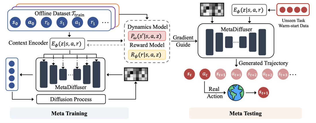 学部2021级博士生倪飞以第一作者(通讯作者:郝建业)撰写的论文MetaDiffuser: Diffusion Model as Conditional Planner for Offline Meta-RL首次提出了基于扩散模型的跨任务规划模型和学习范式,实现可泛化的机器人智能控制。近年来扩散模型在图像视频生成任务上展现了惊艳的可控生成能力,能精细生成与条件高度相关的内容,那么能否利用这种可控生成能力赋能机器人控制任务?为此该工作提出元扩散模型(MetaDiffuser),通过多任务的离线数据预训练出上下文推断编码器,嵌入增广的扩散模型中进行可泛化的控制轨迹条件生成,提升机器人的规划控制对不同环境变化、任务变化的适应能力和鲁棒性。