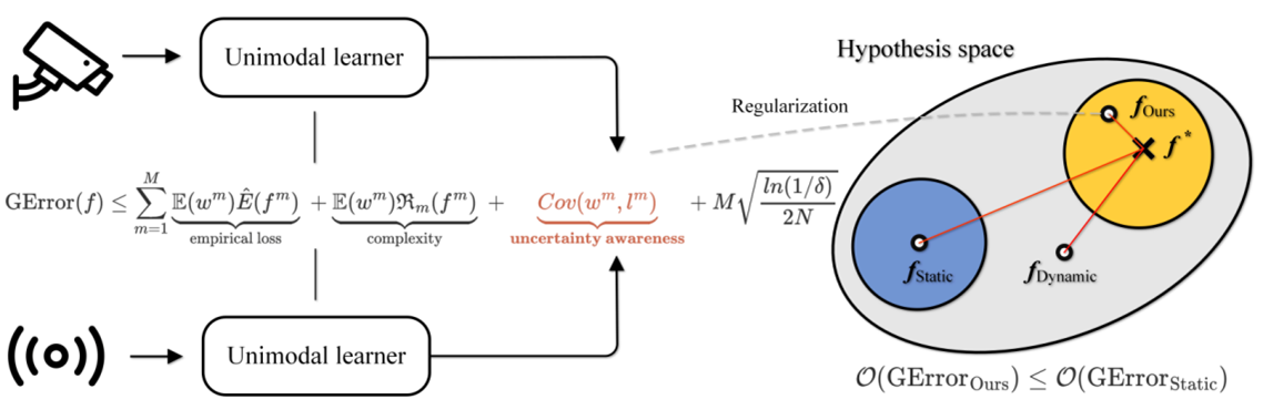 学部2022级硕士张庆阳以第一作者(通讯作者:张长青)撰写的论文Provable Dynamic Fusion for Low-Quality Multimodal Data首次给出了多模态动态性的理论结果。多模态融合是多模态学习领域的基础问题。近年来,多模态动态融合在复杂场景的感知任务上取得了瞩目的效果。然而,其发挥作用的机理一直是悬而未决的开放性问题:为什么动态融合优于广泛应用的静态融合?符合什么条件的动态性是多模态融合的保障?针对上述问题,该工作给出了严谨的理论分析和证明(Provable Dynamic Fusion),明确给出了实现有效动态性的前提条件,以及不确定性估计和多模态融合任务之间的关联。