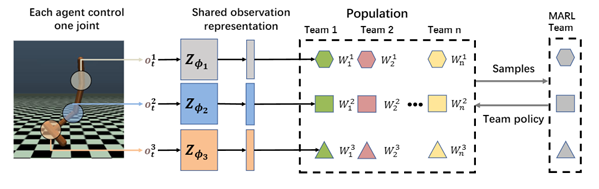 学部2022级博士生李鹏翼以第一作者(通讯作者:郝建业)撰写的论文RACE: Improve Multi-Agent Reinforcement Learning with Representation Asymmetry and Collaborative Evolution在复杂多智能体协作任务中首次证明了演化算法具有进一步提升多智能体强化学习算法的能力。尽管多智能体强化学习近年来在学习协作方面展现了有效性,但当面临质量较低的奖励信号和高度非稳态情况时,MARL的表现可能较差甚至失败。相比之下,进化算法在收敛性、鲁棒性和对信号质量不敏感性方面表现更好。为此,本文提出RACE充分融合两者优势促进多智能体高效协作。为了高效的知识共享与探索,RACE解耦团队策略为共享局部观测编码器与独立的个体策略表征。为缓解局部观测带来的非稳态问题,RACE构建了价值感知的互信息最大化机制来将好的全局信息压缩到共享观测表征中。除此之外,RACE还设计了基于个体的语义性交叉和变异算子对种群进行进化。最终RACE在复杂连续控制任务MAMUJOCO和离散微操任务星际争霸Ⅱ上被证明能够显著提升基准算法并超越其他基线。