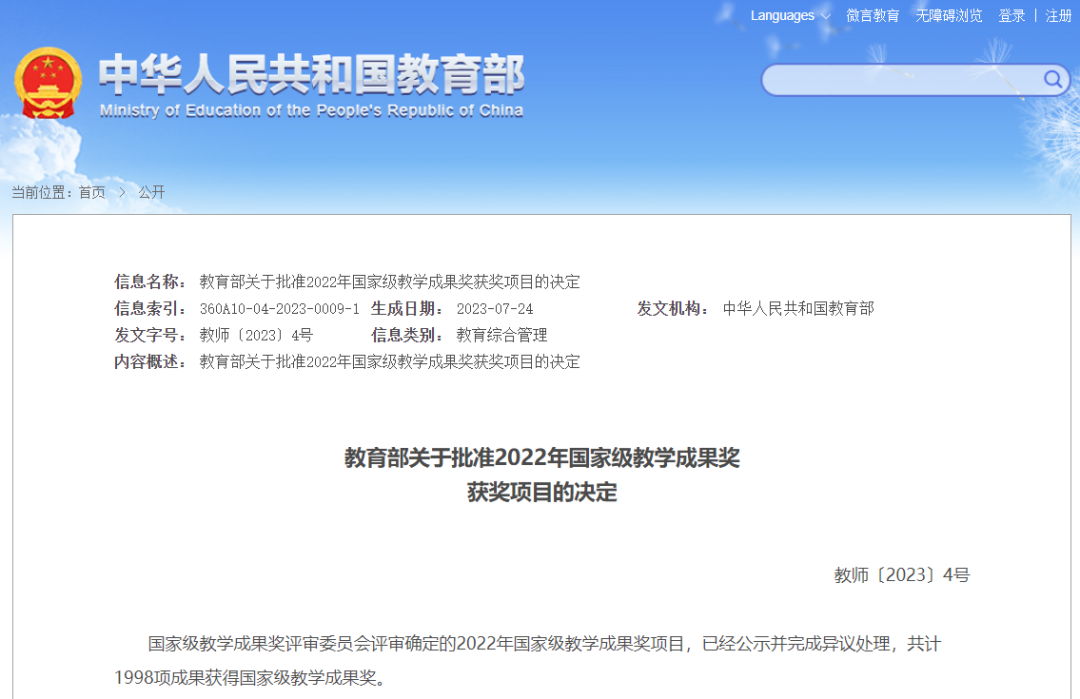 高等教育国家级教学成果奖是国务院确定的国家级奖励,每四年评选一次,是国家加快建设教育强国、落实立德树人根本任务的重要举措,是对学校人才培养工作和教育教学改革成果的检阅和展示。