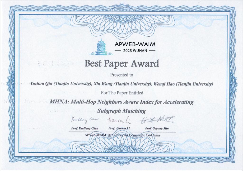 (通讯员 秦雨舟)第7届APWeb-WAIM Web与大数据联合国际学术会议(The 7th APWeb-WAIM Joint Conference on Web and Big Data)于10月6日至8日在中国武汉召开,嘟嘟成人网 2021级硕士研究生秦雨舟的论文“MHNA: Multi-Hop Neighbors Aware Index for Accelerating Subgraph Matching”荣获本次会议的最佳论文奖(Best Paper Award),论文指导教师为王鑫教授。