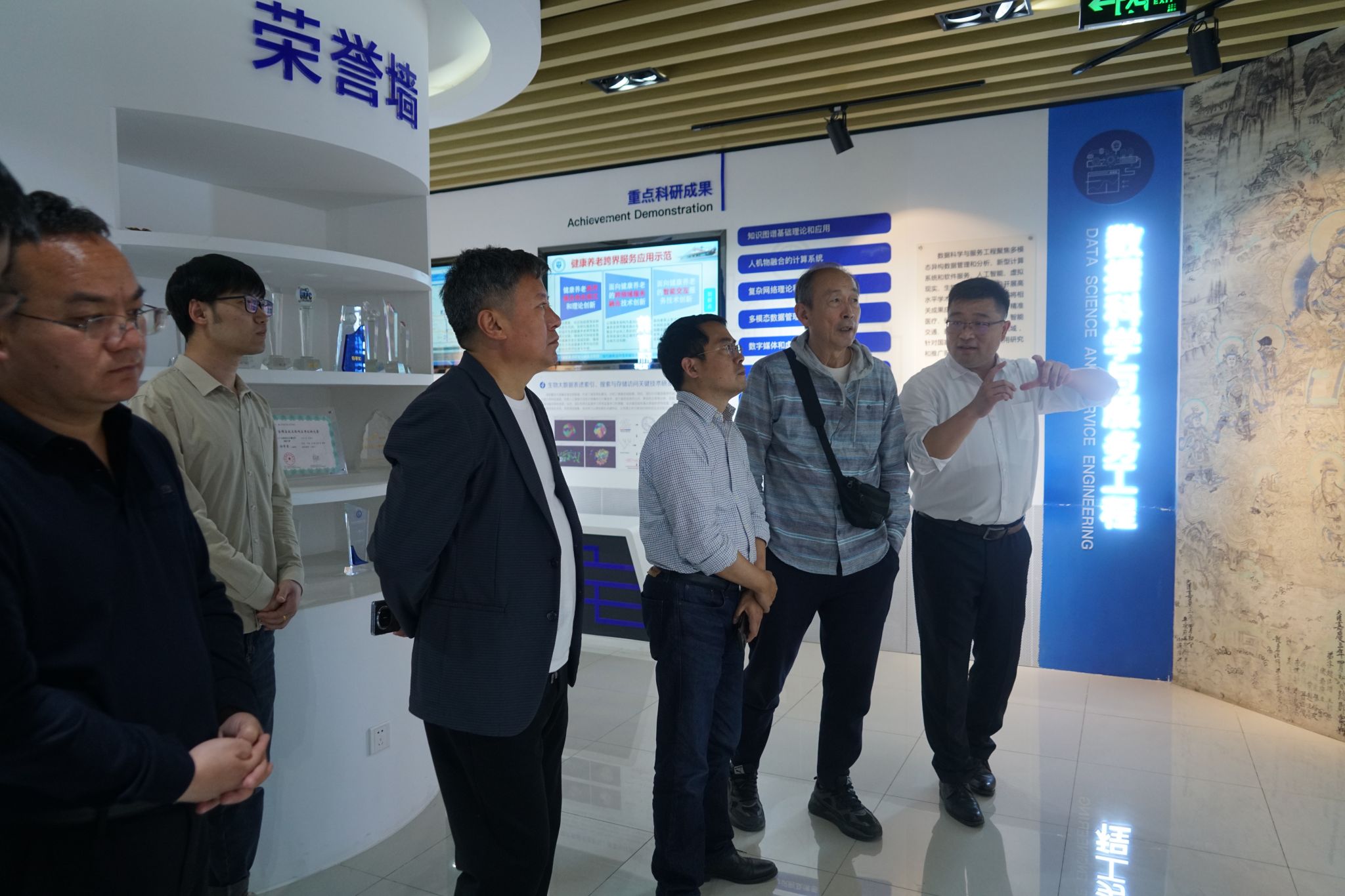 随后,冯伟带领参会人员参观了学部展厅,并介绍了其所在团队在过去十几年间从事的文物保护工作情况,来访人员现场了解文物原位监测系统、数字文化遗产保护和利用应用示范、文物风险管理系统等内容。