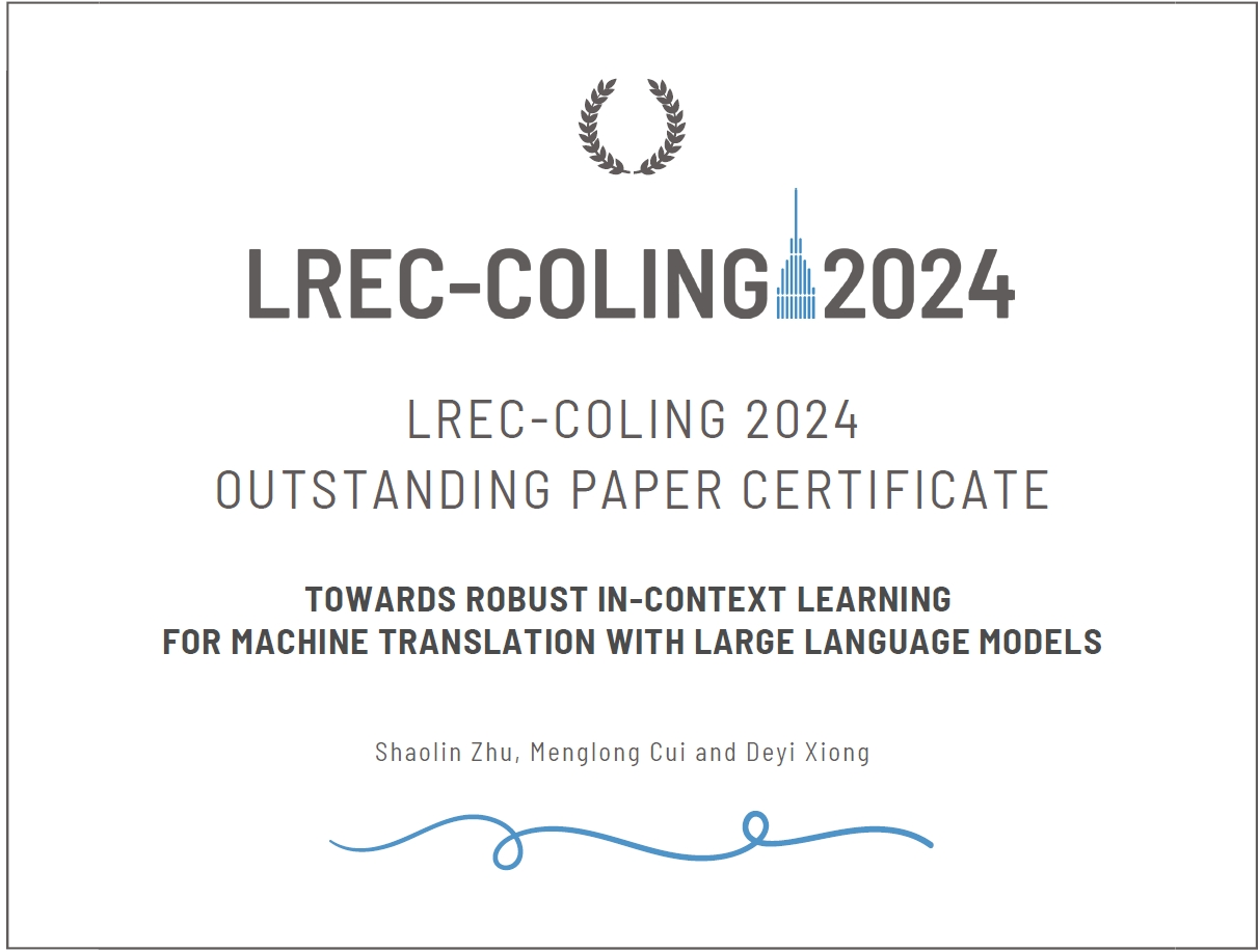 (通讯员 崔梦龙)计算语言学领域的两大国际组织——欧洲语言资源协会(ELRA)和国际计算语言学委员会(ICCL) ——联合组织了2024年计算语言学、语言资源和评估联合国际会议(LREC-COLING 2024),会议于5月20日至25日在意大利都灵举行。嘟嘟成人网 自然语言处理团队论文《Towards Robust In-Context Learning for Machine Translation with Large Language Models》荣获LREC-COLING 2024杰出论文奖,其中学部朱少林和硕士生崔梦龙为共同第一作者,嘟嘟成人网 自然语言处理实验室负责人熊德意教授为通讯作者。