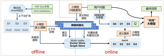效率方面,开发团队依靠技术优势集成了多项推理引擎优化技术,有效提升了模型服务效率。通过KV Cache多级复用,大幅降低长上下文问答与检索增强场景下的推理时延;采用抢占式细粒度作业调度策略,确保高并发场景中的模型响应速度;进一步设计了大小模型的协同推理部署,定制化小模型负责快速处理关键词提取与问题重写,“天问”大模型则专注于最终的回答生成与上下文压缩,充分利用模型性能优势,实现高效的端到端推理流程。