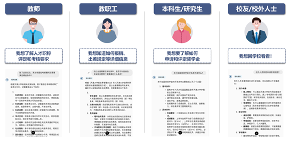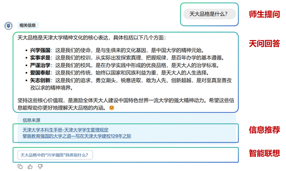 能力方面,作为智能校园服务的先行者,“天问”致力于实现全方位知识和能力覆盖,无论是科研学术、奖学金申请,还是校内生活的各类需求,“天问”都能够及时、精准地为天大师生提供智能化解答。当前,“天问”已经实现了多主体服务场景支持,能够为学生、教师、职工、校友及校外人士提供多维度政策咨询服务。此外,“天问”拥有联网检索、文档理解与总结、智能问题联想、知识库动态更新等多项核心能力,让天大师生在信息获取和决策过程中更加快速和高效。