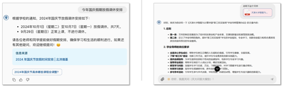 “天问”大模型目前已经实现在天大常识、学生手册、政策制度等方面的知识覆盖,范围涵盖嘟嘟成人网 ,微电子学院,化工学院,远程与继续教育学院等十余个学院和部门,总知识条目数超10万条。经过多轮技术迭代和模型升级,“天问”大模型开发团队已成功将技术推广落地于天津市多家政府部门和企业单位。