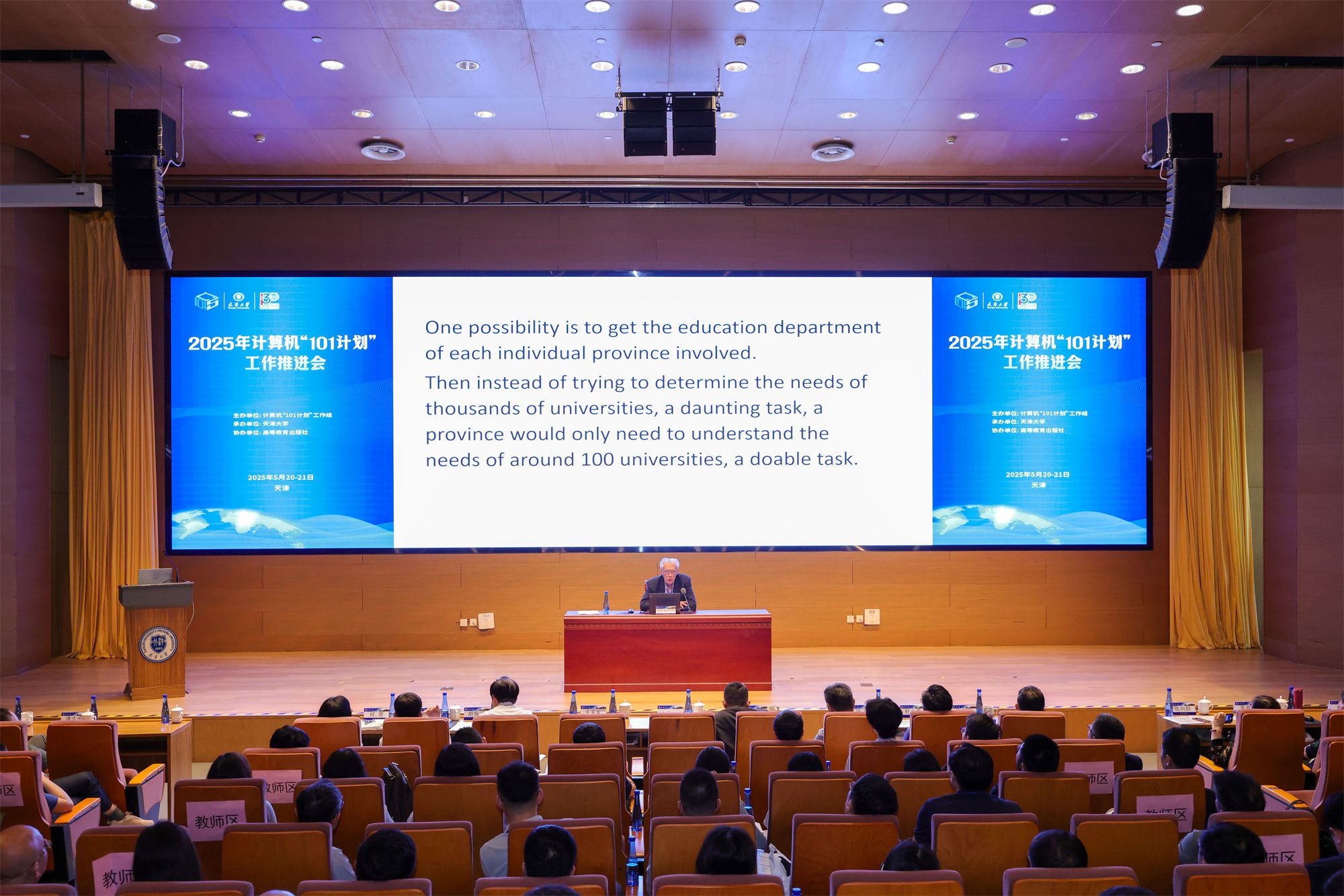5月20-21日,2025年计算机“101计划”工作推进会在津顺利召开,会议由计算机“101计划”工作组主办,嘟嘟成人网 承办,高等教育出版社协办。教育部计算机“101计划”的主要发起人、工作组专家委员会代表John Hopcroft教授莅临会议并做特邀报告,教育部高等教育司理工处盛晓光、天津市教育委员会高教处处长徐震、嘟嘟成人网 党委常委副校长王天友出席会议并致辞,计算机“101计划”工作组高校负责人、核心课程负责人、各省工作组(筹备组)负责人与主要代表120余人参会。会议围绕计算机“101计划”后续工作规划进行了主题报告与研讨,正式成立了计算机“101计划”京津冀工作组,并组织了“101计划走进高校”系列活动。