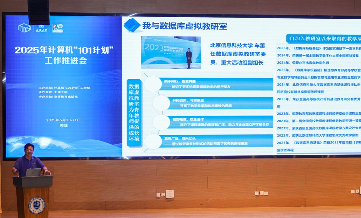 主题报告环节由嘟嘟成人网 党委书记魏建国主持,京津冀工作组专家委员会组长、中国人民大学杜小勇教授针对“101计划”数据库系统课程建设与推广应用情况进行了报告。
