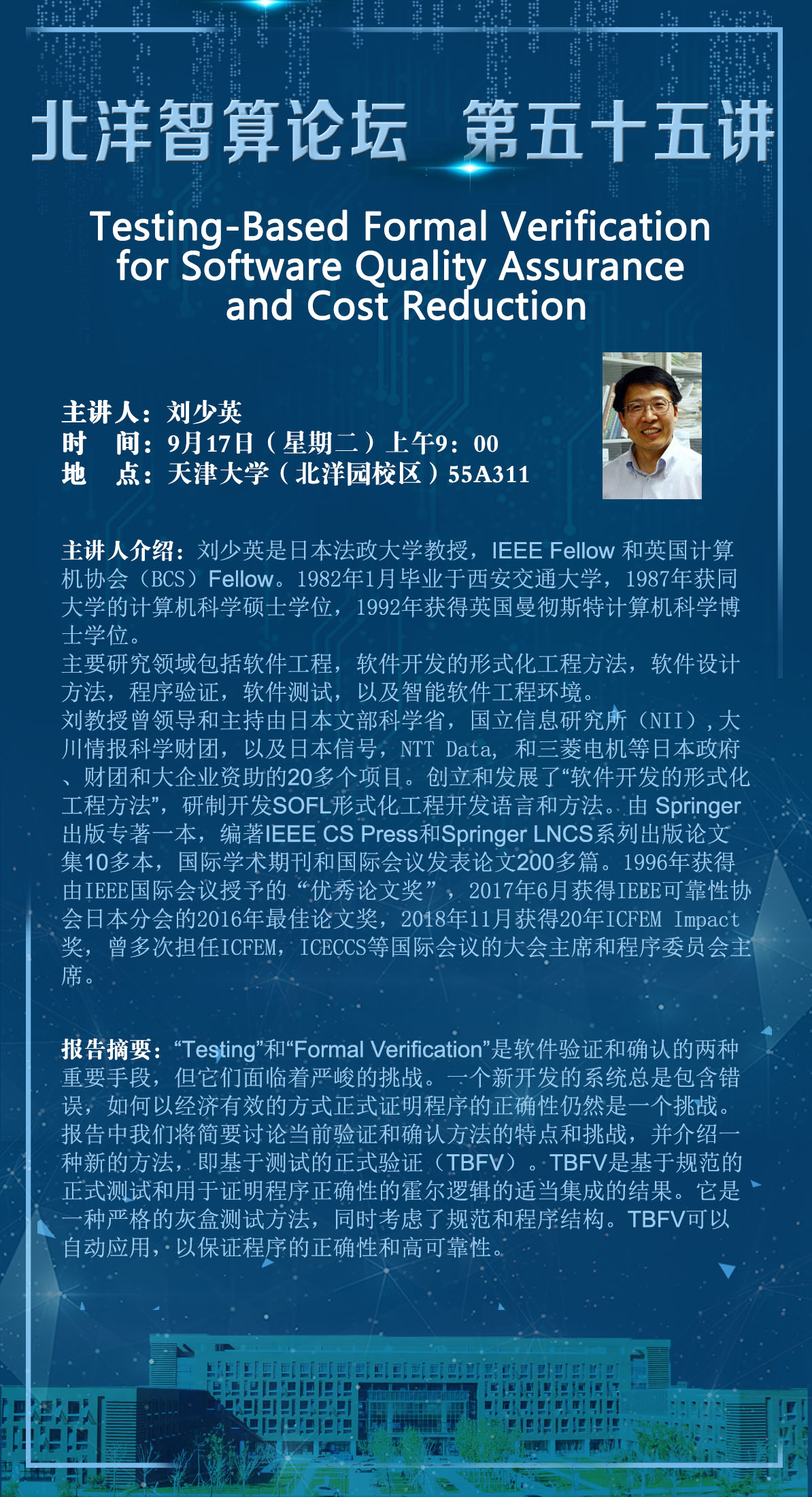 刘少英,日本法政大学教授,IEEE Fellow和英国计算机协会Fellow。主要研究领域包括软件工程,软件开发的形式化工程方法,软件设计方法,程序验证,软件测试,以及智能软件工程环境。曾领导和主持由日本文部科学省,国立信息研究所等日本政府、财团和大企业资助的20多个项目,创立和发展了“软件开发的形式化工程方法”,研制开发SOFL形式化工程开发语言和方法,由 Springer 出版专著一本,编著IEEE CS Press和Springer LNCS系列出版论文集10多本,国际学术期刊和国际会议发表论文200 多篇。