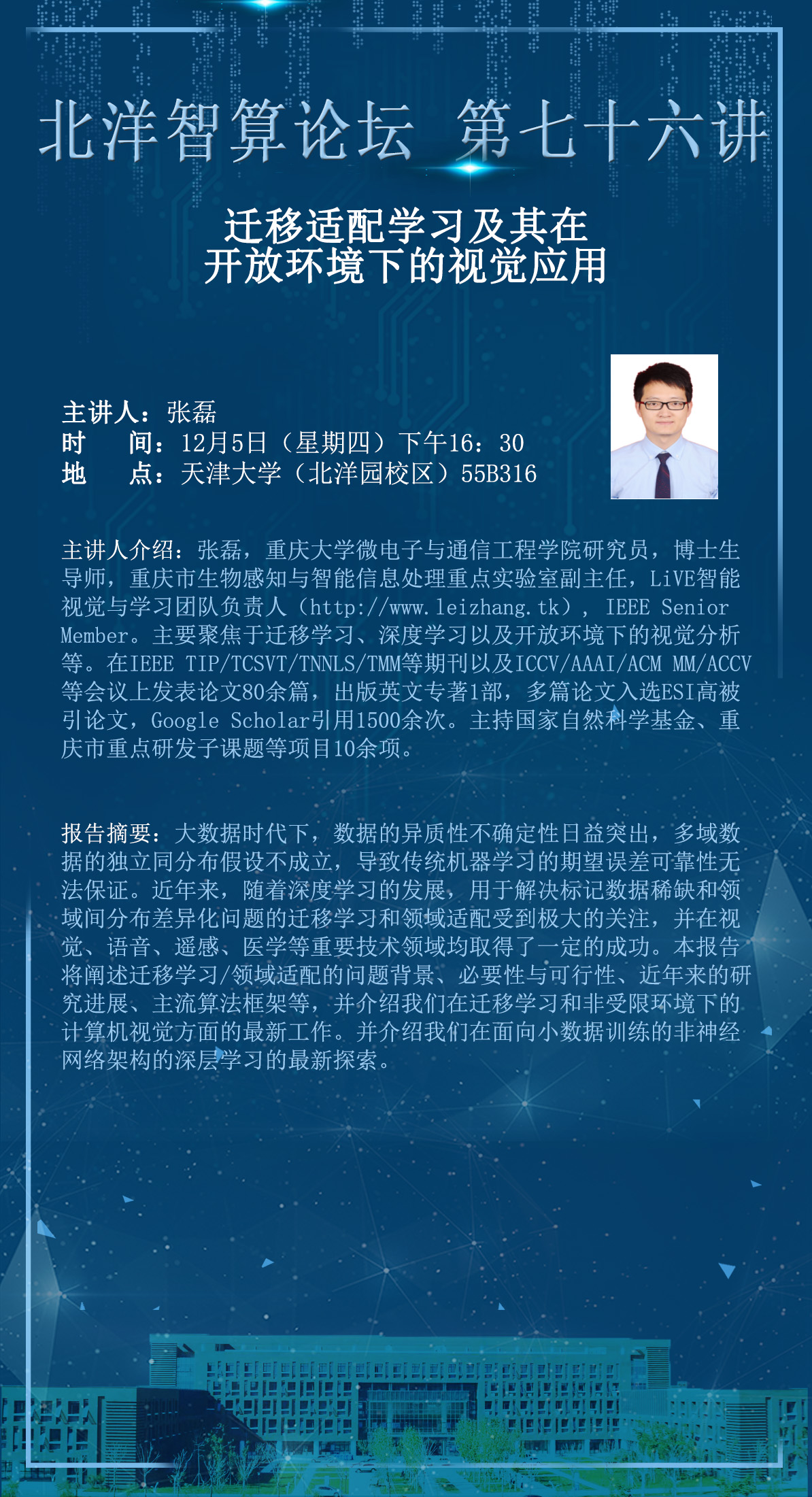 张磊,重庆大学微电子与通信工程学院研究员,博士生导师,重庆市生物感知与智能信息处理重点实验室副主任,LiVE智能视觉与学习团队负责人(//www.leizhang.tk), IEEE Senior Member。主要聚焦于迁移学习、深度学习以及开放环境下的视觉分析等。在IEEE TIP/TCSVT/TNNLS/TMM等期刊以及ICCV/AAAI/ACM MM/ACCV等会议上发表论文80余篇,出版英文专著1部,多篇论文入选ESI高被引论文,Google Scholar引用1500余次。主持国家自然科学基金、重庆市重点研发子课题等项目10余项。