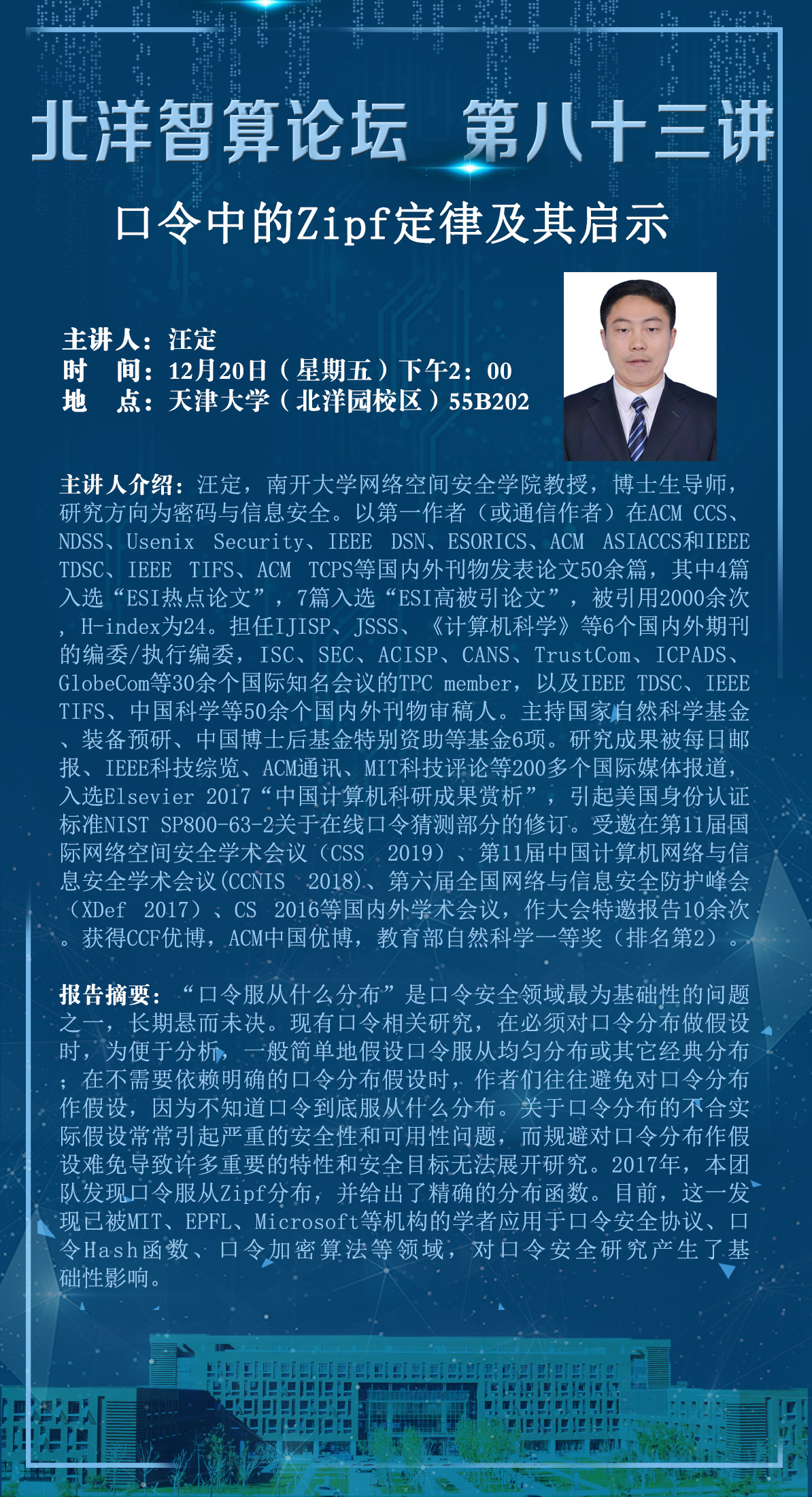 汪定,南开大学网络空间安全学院教授,博士生导师,研究方向为密码与信息安全。以第一作者(或通信作者)在ACM CCS、NDSS、Usenix Security、IEEE DSN、ESORICS、ACM ASIACCS和IEEE TDSC、IEEE TIFS、ACM TCPS等国内外刊物发表论文50余篇,其中4篇入选“ESI热点论文”,7篇入选“ESI高被引论文”,被引用2000余次, H-index为24。担任IJISP、JSSS、《计算机科学》等6个国内外期刊的编委/执行编委,ISC、SEC、ACISP、CANS、TrustCom、ICPADS、GlobeCom等30余个国际知名会议的TPC member,以及IEEE TDSC、IEEE TIFS、中国科学等50余个国内外刊物审稿人。主持国家自然科学基金、装备预研、中国博士后基金特别资助等基金6项。研究成果被每日邮报、IEEE科技综览、ACM通讯、MIT科技评论等200多个国际媒体报道,入选Elsevier 2017“中国计算机科研成果赏析”,引起美国身份认证标准NIST SP800-63-2关于在线口令猜测部分的修订。受邀在第11届国际网络空间安全学术会议(CSS 2019)、第11届中国计算机网络与信息安全学术会议(CCNIS 2018)、第六届全国网络与信息安全防护峰会(XDef 2017)、CS 2016等国内外学术会议,作大会特邀报告10余次。获得CCF优博,ACM中国优博,教育部自然科学一等奖(排名第2)。