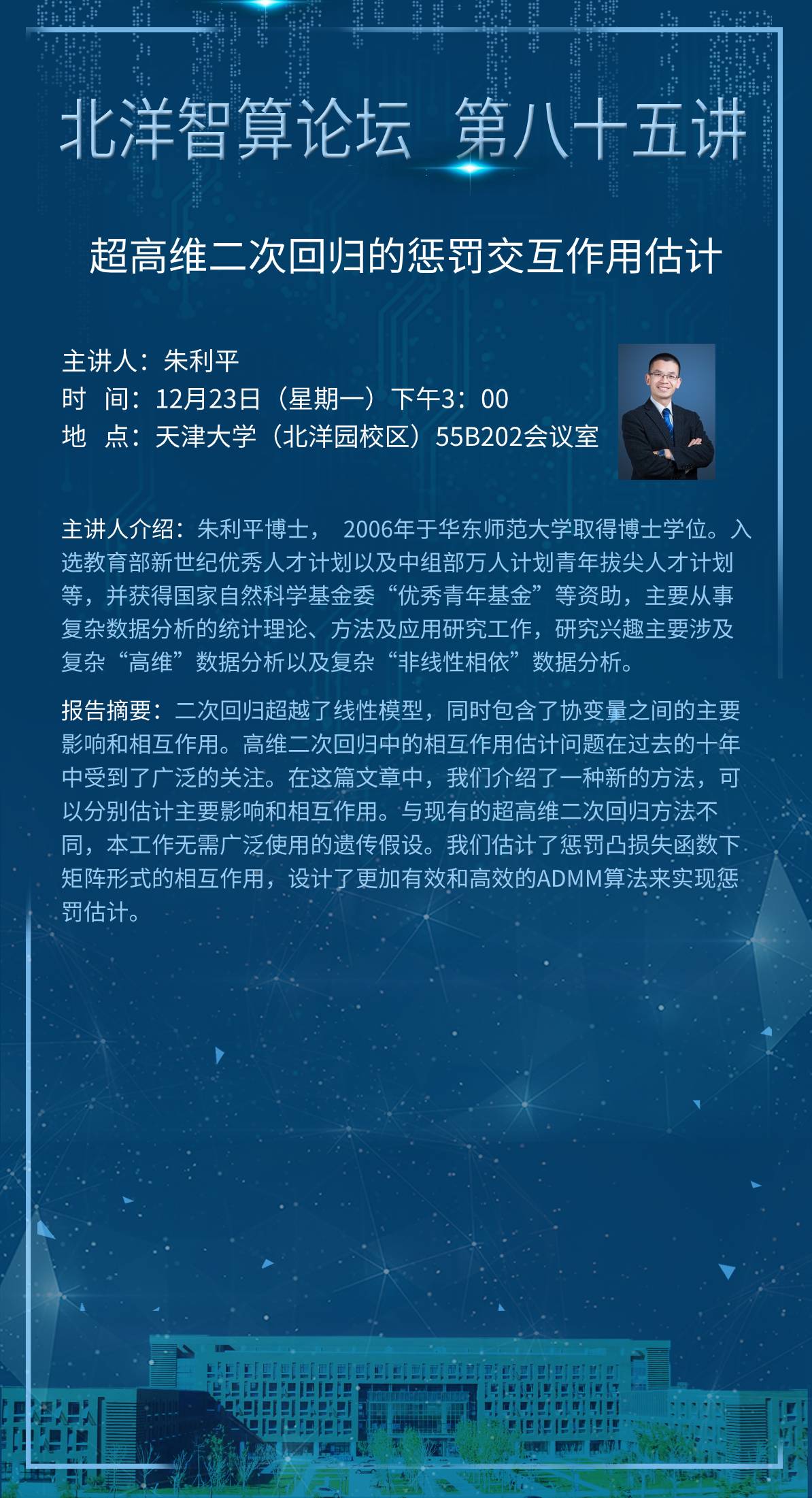 朱利平博士, 2006年于华东师范大学取得博士学位。入选教育部新世纪优秀人才计划以及中组部万人计划青年拔尖人才计划等,并获得国家自然科学基金委“优秀青年基金”等资助,主要从事复杂数据分析的统计理论、方法及应用研究工作,研究兴趣主要涉及复杂“高维”数据分析以及复杂“非线性相依”数据分析。