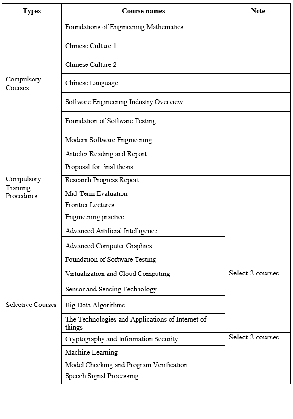 The major is objected to cultivate talents with global vision, innovative spirit and practical ability with solid professional knowledge. School of Computer Software of Tianjin University makes use of superior resources, advanced teaching ideas, rich teaching resources, technology research resources and application implementation experience to teach the leading software engineering technology, and cultivate senior personnel who are urgently needed by software industry. In this field, students need to master the latest technologies of modern software engineering and the knowledge in related fields. On the basis of the study of modern software engineering and other professional courses, this training program will cultivate students' ability to analyze and solve complex software engineering and train students to master the knowledge and professional skills in software engineering deeply, through enterprise level practice, through the actual project exercise.