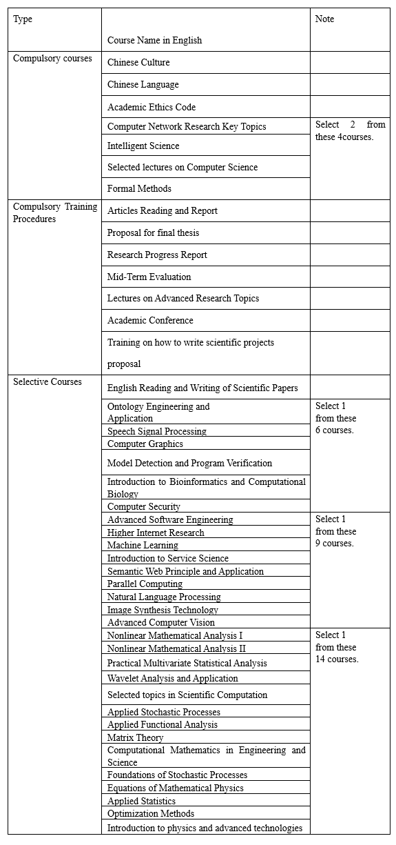 The overall goal is to cultivate outstanding talents with global vision, innovative spirit and practical ability. This program is aimed to develop high-level professionals in computer science and technology filed in all-round way including the morality, intelligence, physical health and art. The Ph.D. students of this profession should master a solid and broad basic theory and systematic in-depth expertise, techniques and methods in computer science and technology. The students shall have ability of doing research work independently, and can produce creative results in his expertise. They are proficient in a foreign language, reading foreign language materials of their specialty, and can write research papers in foreign languages. They have abilities to work in research, teaching and technology development work in higher education institutions, research institutions and related industry sectors.