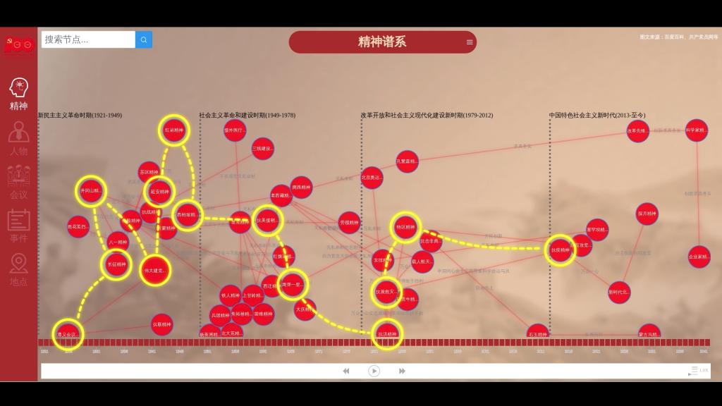 在一百年非凡奋斗历程中,中国共产党人顽强拼搏、不懈奋斗,构筑起了中国共产党人的精神谱系。在专题学习界面,该系统基于党史知识图谱开发了精神谱系专题知识图谱,该图谱撷取建党百年各历史时期重要精神,展示党的光辉历程和伟大成就。