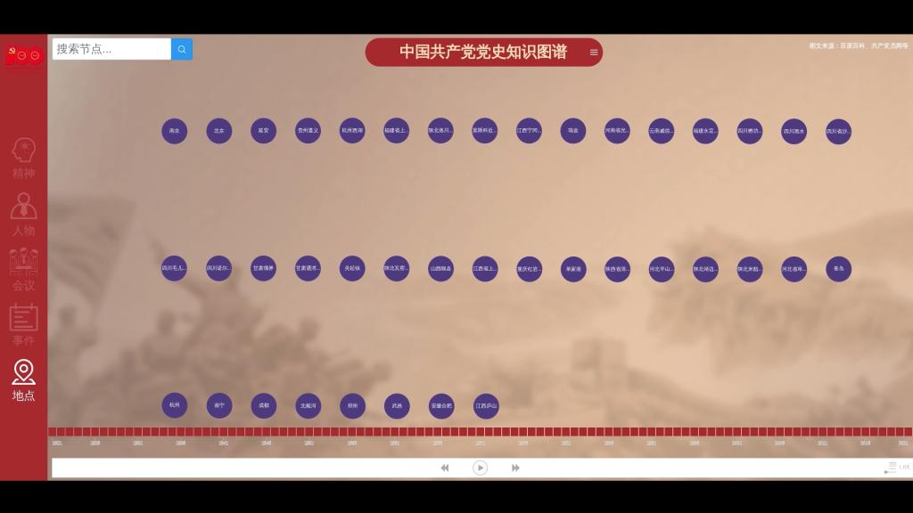 主界面采用不同颜色的节点生动呈现中国共产党发展历程中的关键人物、地点、事件、会议与精神。